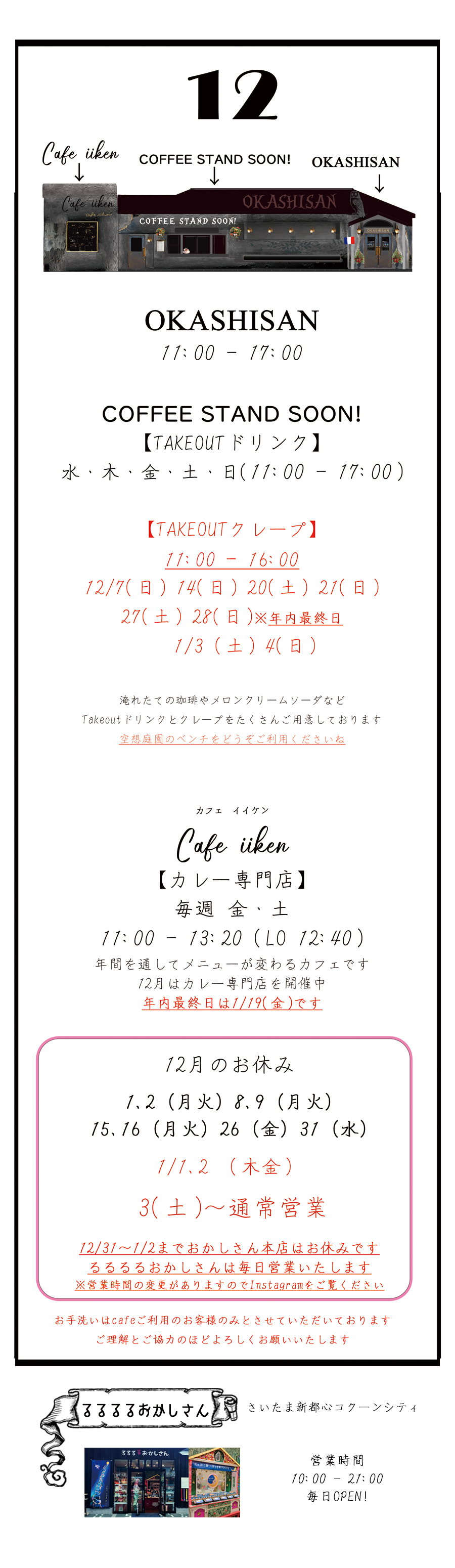 2013 / 400名 無料 おかしさん本店 / 上落合公園 2014 / 1.000名 無料 おかしさん本店 / 上落合公園 2015 / 1.500名 無料 おかしさん本店 / 上落合公園 2016 / 1.800名 無料 おかしさん本店 / 上落合公園 2018 / 400名 予約制 無料 アナザウェイ ㈱ジェイアール東日本都市開発 協力 2019 / 100名 予約制 有料 コクーンホール 片倉工業(株) 協力