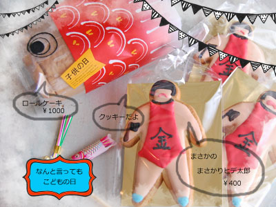 忘れてはなりませぬ。子どもの日。まァ、MASUOは何もお祝いされた記憶はありませんが…。。せっかくの行事です!楽しくお祝いしましょう☆ 鯉味ではない鯉のぼりのロールケーキ¥1000と今回もヒデ夫が金太郎になった、まさかのまさかりヒデ太郎¥400(クッキーです)をご用意してお待ちしております♪5/5までの限定商品ですよ~※終了しました |