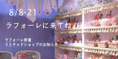 8/8 (木) ~ 21 (水) までラフォーレ原宿1FでコンテナショップをOPEN!!!なんと1000種類以上のアンティークパーツとかわいい雑貨が所狭しと並ぶのだとか!乙女な皆様、ぜひぜひご来店下さい!