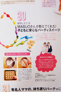 同じくニナーズさんにて「コレ★イイ ニュース50特集」にMASUOのパーティースイーツが掲載されています。“子供に安心なパーティースイーツ”としてヨーグルトクッキーをお作りしました。もちろんレシピ付き。そして出来上がったお菓子をネックレスに見立ててラッピングする方法もご提案しています。これ、盛り上がるんだよね~、お試しあれです。