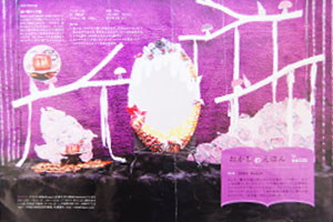 MASUOが一番好きなお花達が歌っているシーンをお菓子で再現しています。真中のケーキに乗っているのはミルクのマシュマロで出来たピアノのけん盤と、シュガーペーストで出来たバラ婦人。下に咲いているお花達に向かって指揮棒を振っています。蝶々は総勢100頭!。きのこのふもとには隠れいもむしさんがいたの知ってたかな?作品を見たほとんどの方はお菓子で出来ていると分からなかったようです。製作期間は3日間かかりました。使用したバタークリームは8k!ショーケースの中は甘い匂いでいっぱいでした!