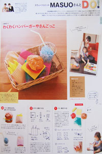 25.1月号の親子雑誌「ニナーズ」(祥伝社)でお菓子の材料を使って本物そっくりに作るちょっとアートなMASUOの連載 『なりきりスイーツ』 です。第4弾のなりきったスイーツはアメリカーンな 『ウーピーバーガー』 です!作りながらも、これちょっと本当にハンバーガーみたい…と自画自賛してしまったMASUOです(笑)