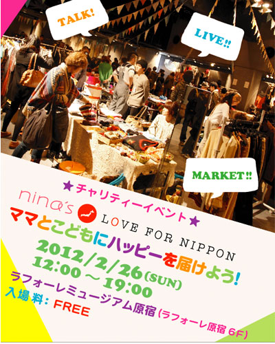 東日本大震災を受け立ち上げた“LOVE FOR NIPPON (ラブフォーニッポン)”と親子ライフスタイル誌“ninas (祥伝社)”のタッグのもと募金活動に加え親子で楽しめるトーク、ライブ、ワークショップなどを行うチャリティーイベントにおかしさんも参加させて頂けることになりました!このイベントで得た収益は被災地の方々の復興支援に繋げていきます。