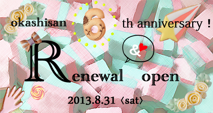 1ヶ月間のお休みを頂きましたおかしさん本店がついに、8/31sat AM 10:00 にリニューアルOPEN致します!いつも応援して下さる皆様のおかげでおかしさんは6周年を迎える事が出来ました!どうもありがとうございます☆感謝の気持ちを込めて、8/31sat